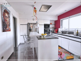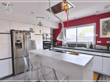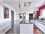 Une cuisine américaine moderne, entièrement équipée, ouverte sur l'espace de vie.
